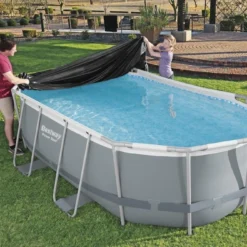 Cover voor Levant ovaal 424. Afdekkleed met bevestigingskoord en drain gaten om overtollig water te lozen. Het kleed valt over het bad heen. Let op: De poten van het bad steken beneden uit, waardoor de afmetingen van de cover kleiner zijn dan de afmetingen van het bad. Afmeting: 418×230 cm.