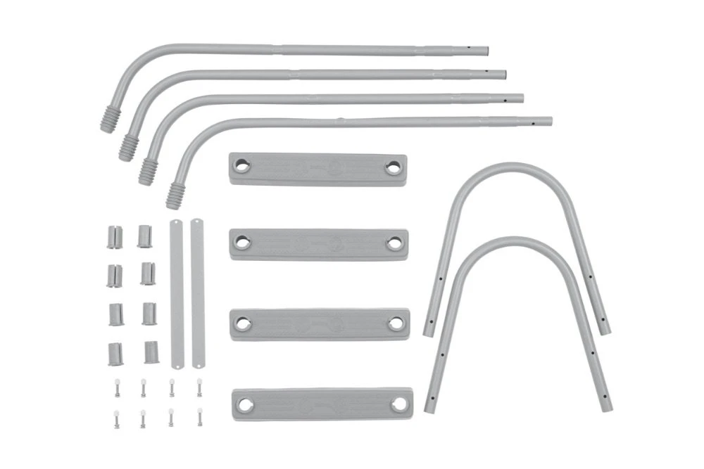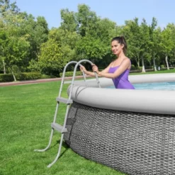 Standaard zwembadtrap. Roestwerend frame met sterke kunststof treden. Eenvoudig te monteren. 2×2 treden. Hoogte: 84 cm.