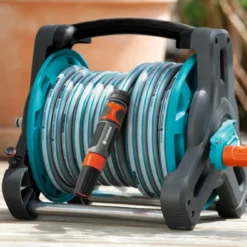 De GARDENA Classic slanghouderl 10 compleet is veelzijdig en compact. Door zijn geringe gewicht is hij eenvoudig te vervoeren en een slang is er veilig opgeborgen. De set is compleet gemonteerd en omvat een slanghouder, een 10 meter lange Classic slang met een diameter van 13 mm (1/2″) en alle benodigde GARDENA System aansluitstukken: drie slangstukken (art.nr. 915), twee kraanstukken (art.nr. 900 en 902), een waterstop (art.nr. 913), een aansluitstuk (art.nr. 5305) en een Classic tuinspuit (art.nr. 8114). Daarom is hij ideaal voor zeer kleine tuinen, terrassen of balkons. Dankzij de ergonomische greep kunt u hem overal probleemloos naar toe brengen en gebruiken. Met de vrijlopende zwengel is deze slanghouder eenvoudig te bedienen. U kunt de zwengel ook inklappen. Zo kan de houder plaatsbesparend worden opgeborgen. De zijkanten van de slanghouder hebben de vorm van een driehoek en een laag zwaartepunt. Dat maakt hem bijzonder stabiel en hij zal niet snel kantelen. Zo wordt water geven veel leuker.