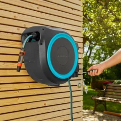 Met de wandslangenbox RollUp XL is het bewateren van een grote tuin aangenaam en eenvoudig. U bevestigt de compacte slangopslag permanent op de muur van uw huis en sluit deze met een aansluitslang aan op de kraan. Dankzij de 35 meter lange slang en de 180 graden draaibare slangenbox is het heerlijk om uw planten te bewateren en is dit geen corvee meer. De slangenhouder volgt uw bewegingsrichting en voorkomt dat de slang gaat knikken of in de war raakt. Nadat u de slang tot de gewenste lengte voor het bewateren hebt uitgetrokken, grijpen de zeer korte vergrendelingspunten zich automatisch vast en blokkeren ze de slang zodra u stopt. Door lichtjes aan het uiteinde van de slang te trekken, wordt het vergrendelmechanisme ontgrendeld en wikkelt een geïntegreerde stalen veer de verlengde tuinslang volledig automatisch, betrouwbaar en gelijkmatig voor u op. Dankzij de innovatieve RollControl-technologie gebeurt het oprollen veilig en gecontroleerd. De geïntegreerde slanggeleider zorgt ervoor dat de slang netjes en gelijkmatig wordt opgerold, zonder dat deze in de knoop raakt. De kraan- en slangaansluitingen van de slangenbox maken deel uit van het Original GARDENA System, zodat u op elk gewenst moment andere GARDENA opzetstukken kunt aansluiten. U hebt altijd uw GARDENA mondstukken bij de hand: ze kunnen onder de muurbeugel worden bevestigd en daar worden opgeborgen om ruimte te besparen. Het hoogwaardige materiaal is UV- en vorstbestendig en bestand tegen weersinvloeden. Daarom kan het systeem het hele jaar door worden gebruikt. Bovendien is de slangopslag beveiligd met een antidiefstalvoorziening. Alle benodigde aansluit- en montageonderdelen worden bijgeleverd in de wandslangenbox RollUp: een muurbeugel, een aansluitslang, alle benodigde Original GARDENA System onderdelen en een mondstuk met twee verschillende sproeiopties. GARDENA geeft vijf jaar garantie op de hoogwaardige slangopslag. Bewatering die altijd gebruiksklaar is , dankzij de GARDENA wandslangenbox RollUp XL.