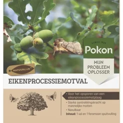 Pokon Eikenprocessiemotval is een detectieval enkel voor monitorings-doeleinde: de aantastingsgraad kan gedurende het hele seizoen gevolgd worden. De val heeft geen invloed op andere, nuttige insecten. Plaats de Pokon Eikenprocessiemotval eind mei/begin juni zo hoog mogelijk in de boom (bij voorkeur > 5 meter) aan een dicht-bebladerde tak. De mannelijke motten worden aangetrokken door het feromoon (de vloeistof uit de spuitvulling), dringen de val binnen en worden gevangen genomen. Het doorzichtige reservoir laat eenvoudig de aanwezigheid van motten zien. Raak het feromoon zo min mogelijk aan om maximale aantrekking te garanderen. De werkingsafstand van het feromoon is gelimiteerd tot 50-100 meter. Voor het beste resultaat plaats 1 val per eikenboom en maximaal 5 vallen per hectare. Inhoud: 1 val en 1 feromoon spuitvulling.